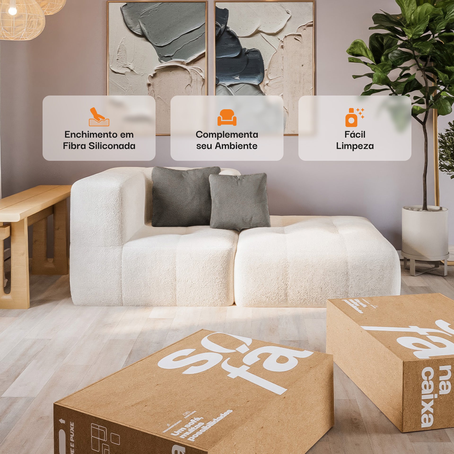 Nosso SOFÁ NA CAIXA, graças à inovadora tecnologia GrowTech, aguenta de 130 a 150kg por módulo, mantendo a forma sem precisar de madeira ou alumínio. Isso significa conforto máximo garantido!