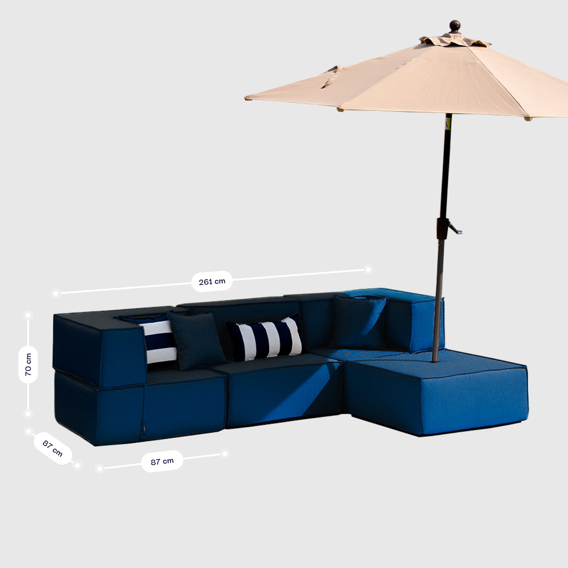 Ele conta com a tecnologia Sunproof®, que garante resistência a manchas causadas por água, vinhos, sucos e outras substâncias. Com este sistema modular e a proteção Sunproof®, você tem total liberdade para personalizar o seu espaço, garantindo conforto, estilo e durabilidade em qualquer configuração.