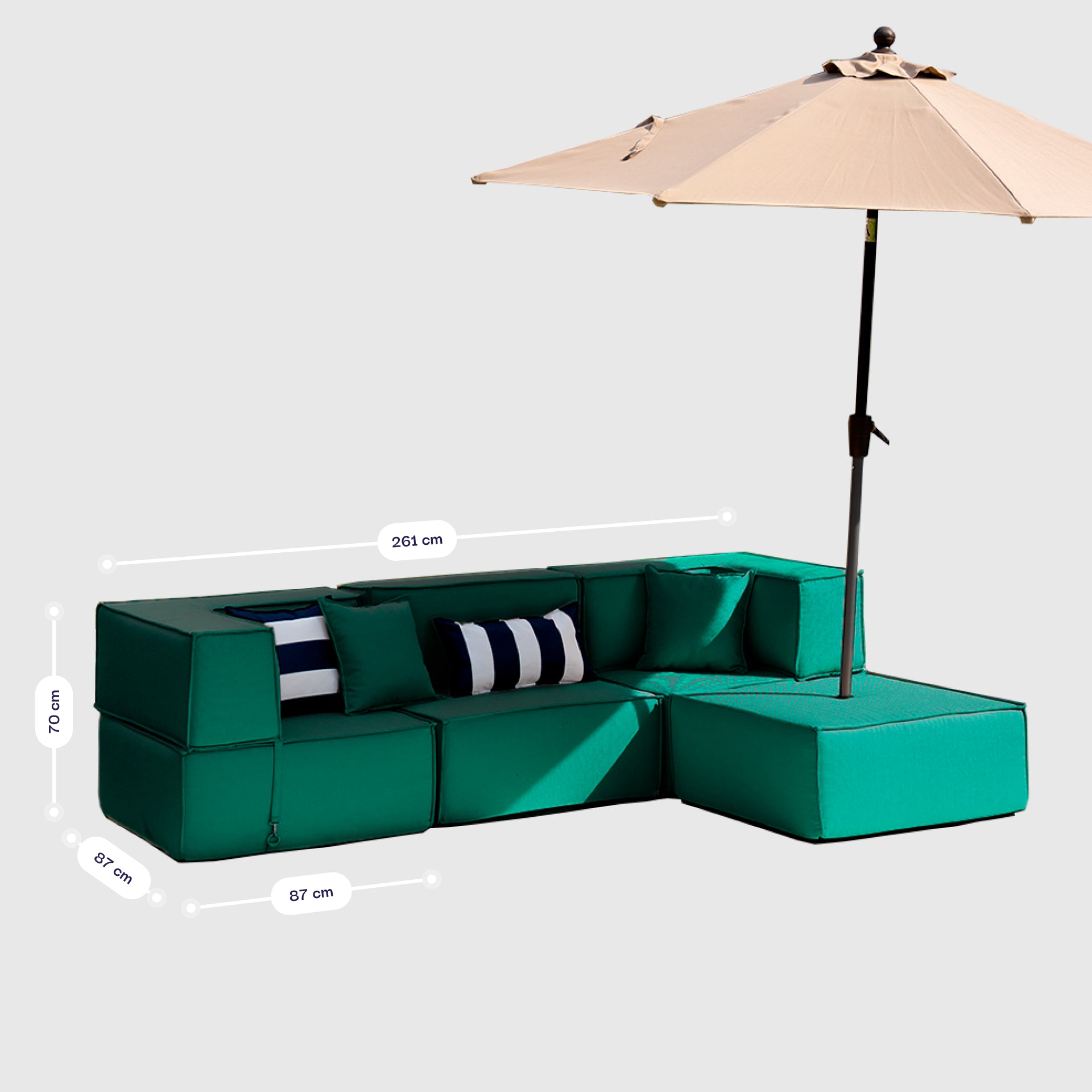 Ele conta com a tecnologia Sunproof®, que garante resistência a manchas causadas por água, vinhos, sucos e outras substâncias. Com este sistema modular e a proteção Sunproof®, você tem total liberdade para personalizar o seu espaço, garantindo conforto, estilo e durabilidade em qualquer configuração.