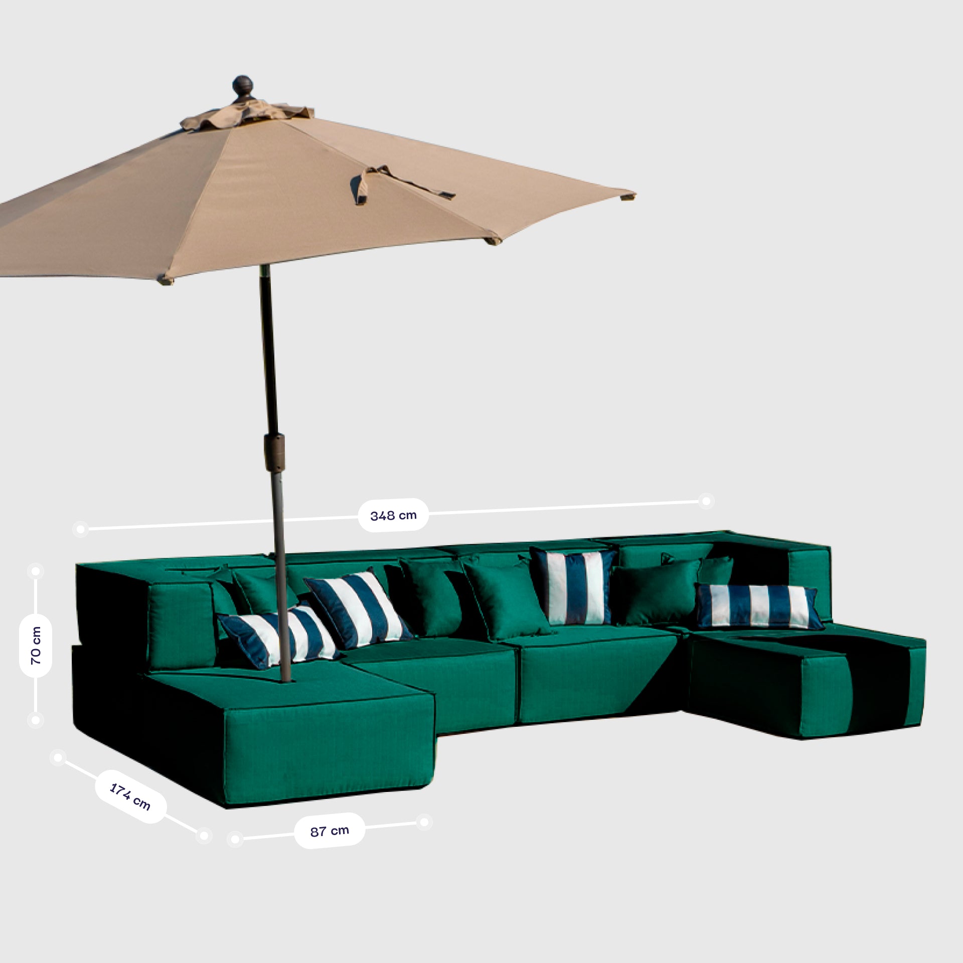 Ele conta com a tecnologia Sunproof®, que garante resistência a manchas causadas por água, vinhos, sucos e outras substâncias. Com este sistema modular e a proteção Sunproof®, você tem total liberdade para personalizar o seu espaço, garantindo conforto, estilo e durabilidade em qualquer configuração.
