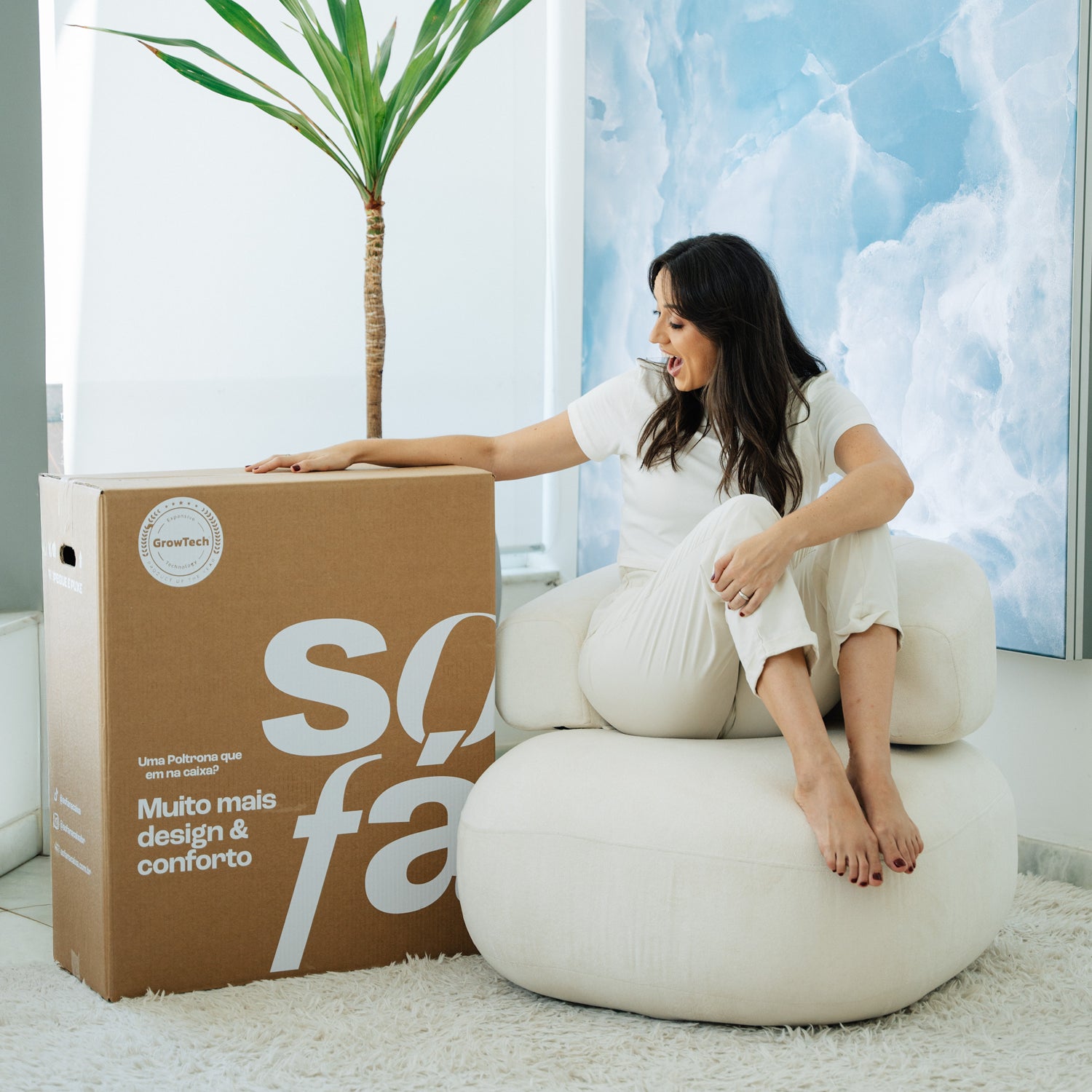 Nosso SOFÁ NA CAIXA, graças à inovadora tecnologia GrowTech, aguenta de 130 a 150kg por módulo, mantendo a forma sem precisar de madeira ou alumínio. Isso significa conforto máximo garantido!