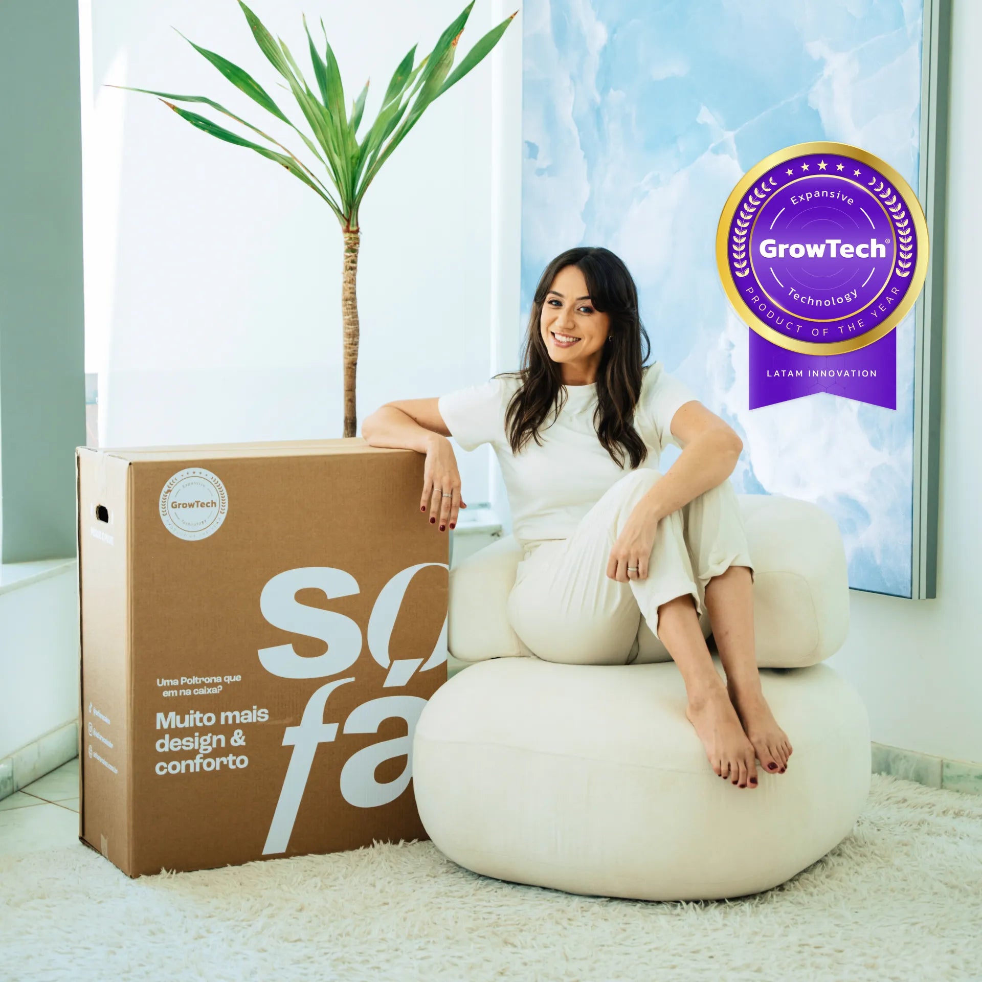 O nosso SOFÁ NA CAIXA vai além das espumas convencionais. Em parceria com nossa equipe de químicos, desenvolvemos a exclusiva molécula GrowTech, aprovada após rigorosos testes. Ela alcança o equilíbrio perfeito: nem muito firme, nem muito mole. Com a densidade ideal, nosso sofá oferece o conforto e suporte que você merece.