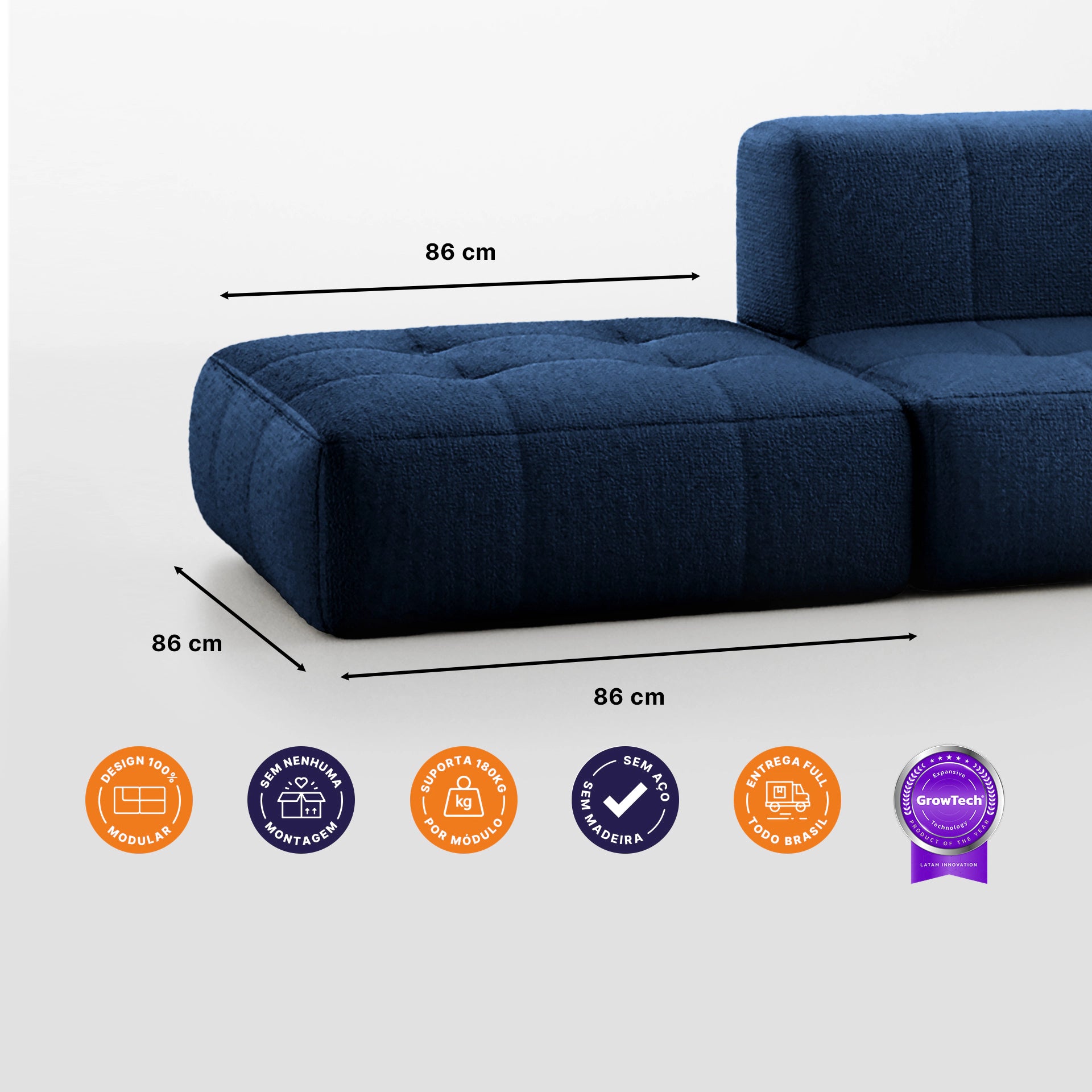 Nosso SOFÁ NA CAIXA, graças à inovadora tecnologia GrowTech, aguenta de 130 a 150kg por módulo, mantendo a forma sem precisar de madeira ou alumínio. Isso significa conforto máximo garantido!