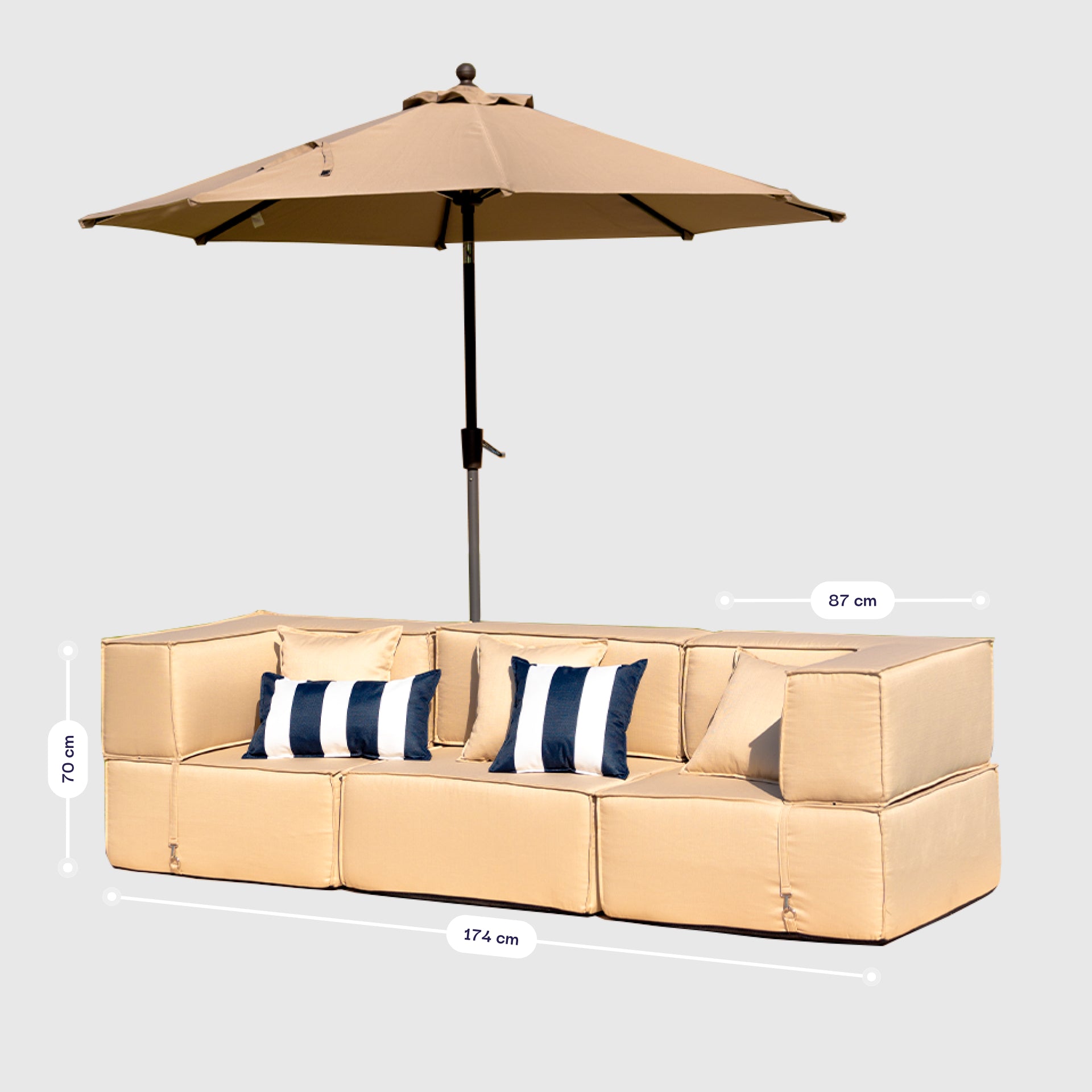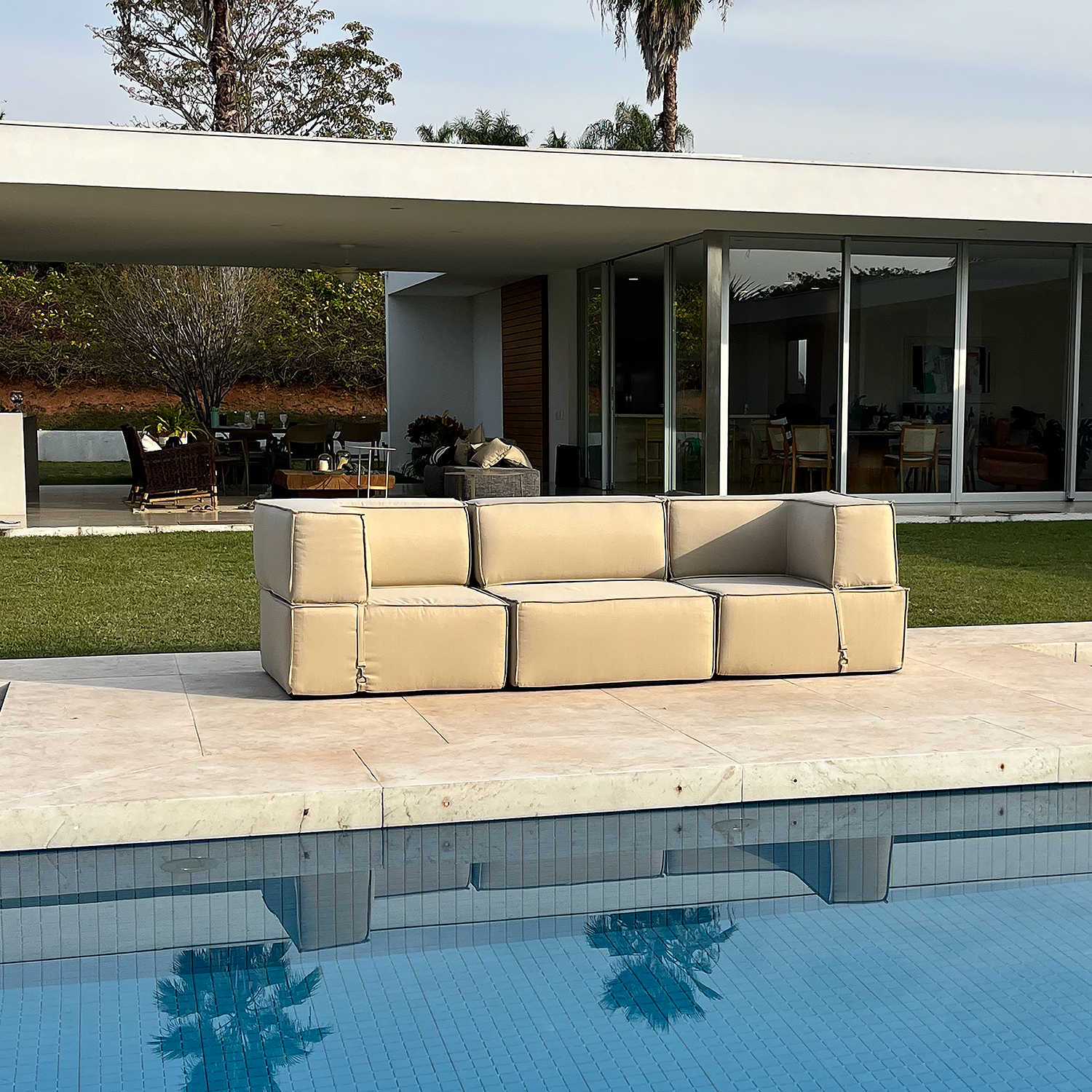 Ele conta com a tecnologia Sunproof®, que garante resistência a manchas causadas por água, vinhos, sucos e outras substâncias. Com este sistema modular e a proteção Sunproof®, você tem total liberdade para personalizar o seu espaço, garantindo conforto, estilo e durabilidade em qualquer configuração.
