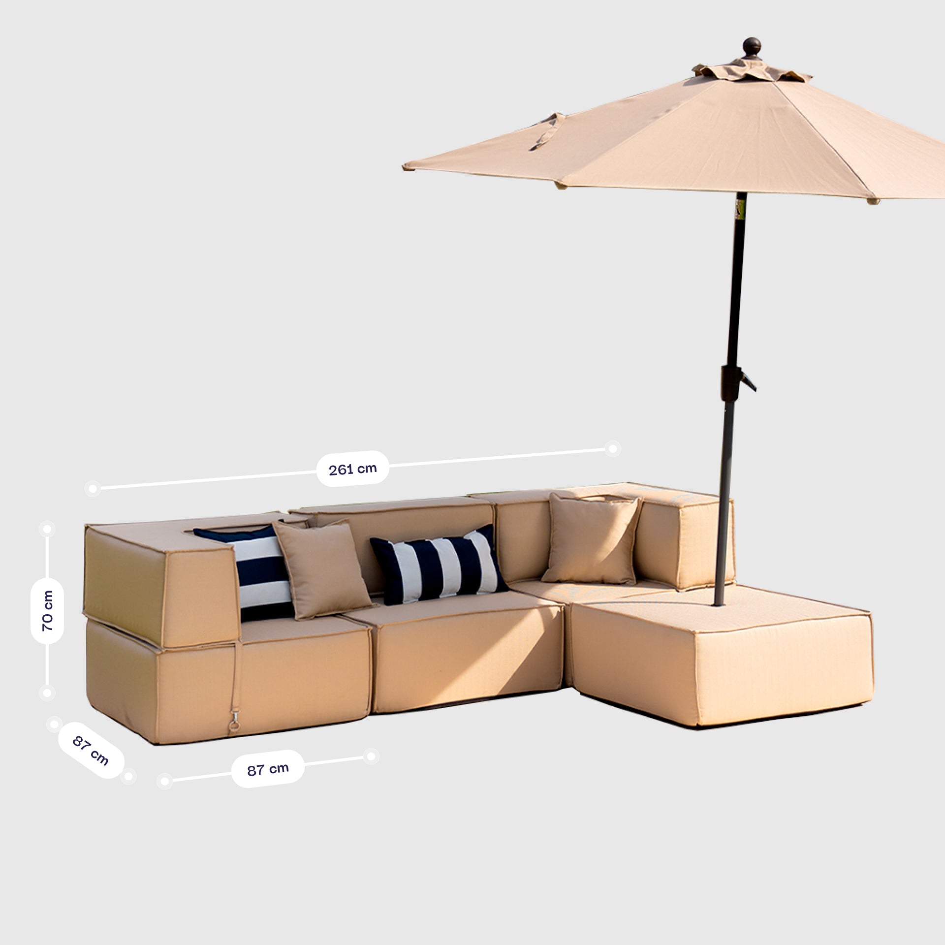 Ele conta com a tecnologia Sunproof®, que garante resistência a manchas causadas por água, vinhos, sucos e outras substâncias. Com este sistema modular e a proteção Sunproof®, você tem total liberdade para personalizar o seu espaço, garantindo conforto, estilo e durabilidade em qualquer configuração.